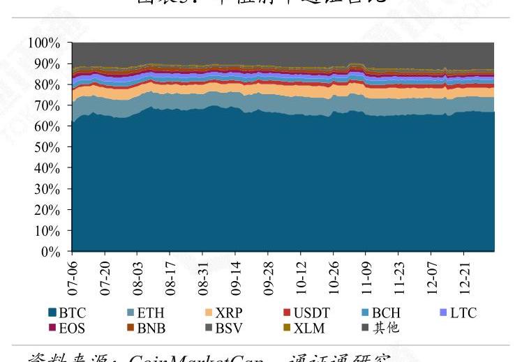 BTC现价7345美元,周涨幅为0.8%,月涨幅为1.3%。本周BTC日均成交量为222亿美元,日均换手率为16.9%。BTC本周整体波动较小,即便有下跌,短时内也可迅速反弹,大概率是位于中期筑底阶段。