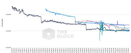 最后,我们通过找出矿工收入和网络价值之间的比率来算出安全率。换句话说,安全率说明了由安全价值所担保的财富价值。正如我们将要讨论的,这个比率的减少导致越来越多的价值被越来越少的安全价值所保护,从而为蓄意攻击提供了可能。