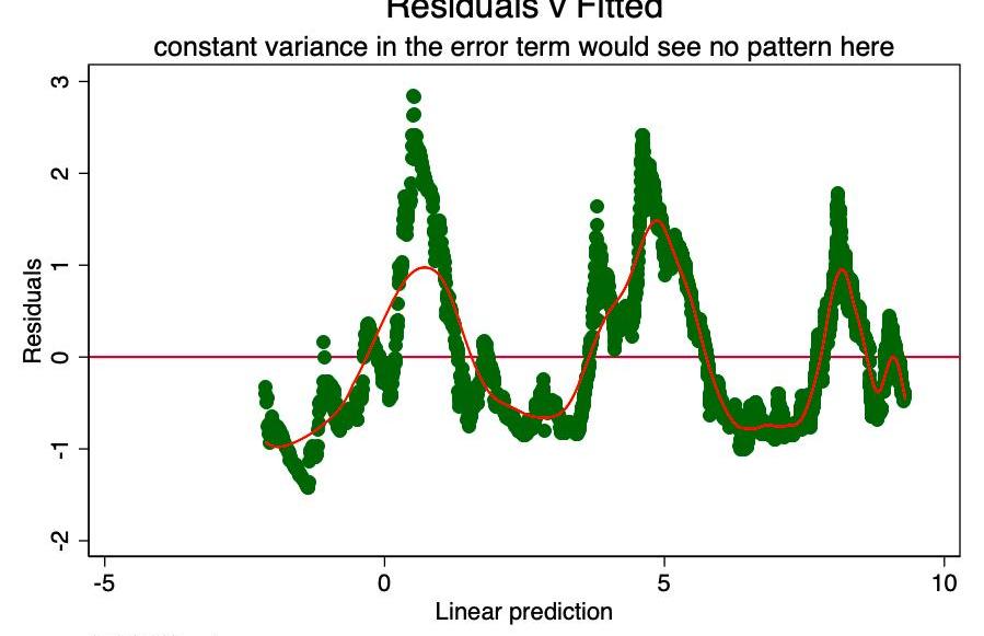 如果误差项中恒定方差的假设为真,则对于预测值中的每个值,误差项将在0附近随机变化。因此,RVF图是研究此假设准确性的简单而有效的图形方法。在图6中,我们看到有一个巨大的模式,而不是随机的散射,表明误差项的非恒定方差。