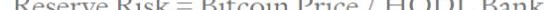 在不同时期持有的资产被定义为HODLBank。持有风险与HODLBank成反比,与BTC价格成正比。也就是说,BTC被存储的越多,持有风险就越低,反之亦然。公式如下: