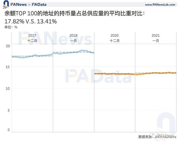 根据统计,17年12月至18年1月期间,余额前100的地址的持币总量占总供应量的平均比重约为17.82%,最高占比约为18.68%。但20年12月至21年1月期间,余额前100的地址的持币总量占总供应量的平均比重下降至13.41%,较上一轮牛市期间降低了约4.4个百分点,筹码分散性进一步加强。