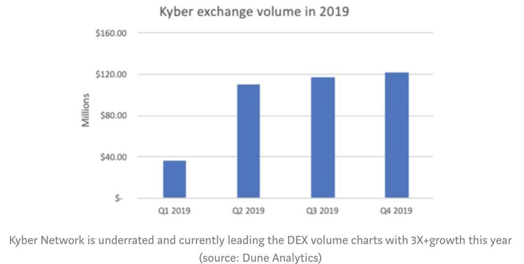 KyberNetwork今年悄悄地创造了最多的DEX交易。这主要归功于它的用户体验,Kyber.Swap现在只占不到40%的Kyber网络交易量,Kyber团队做了非常棒的工作,他们将Kyber智能合约集成到许多以太坊产品中。