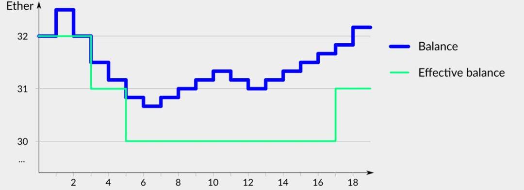 如上文所述,履行了职责的验证者会获得奖励,不履行职责的验证者会得到惩罚。奖惩情况会反映在验证者的余额上,正如下图虚构的验证者余额变化情况所示: