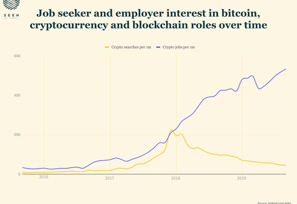 比特币、区块链和加密货币的搜索量在下降,但雇主的需求却在飙升。根据Indeed.com的数据,在2015年9月至2019年9月的四年间,这类岗位在所有工作类型中的占比增长了1457%。在同一时期,搜索量占比只增长了469%。