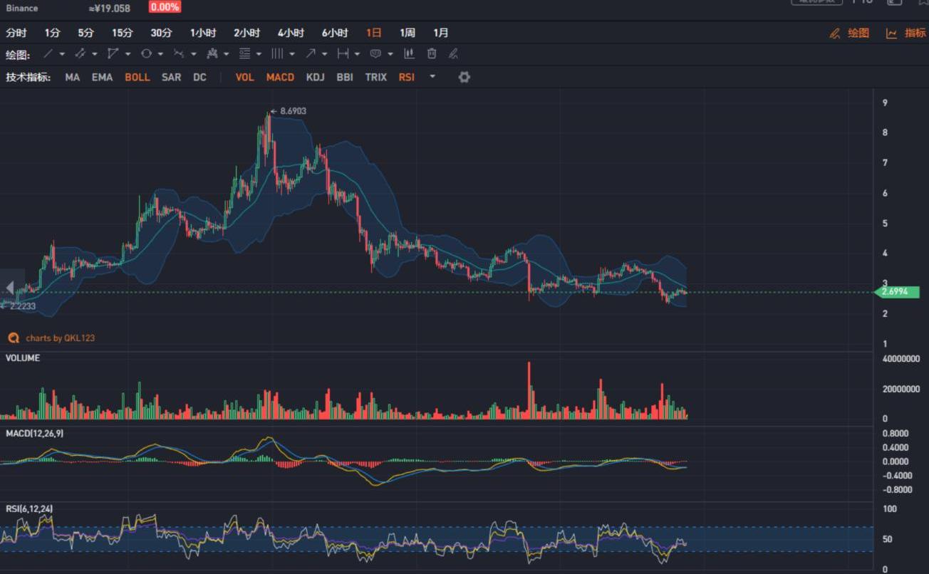目前,EOS在2.6美元附近缩量震荡,短时变盘风险较大。