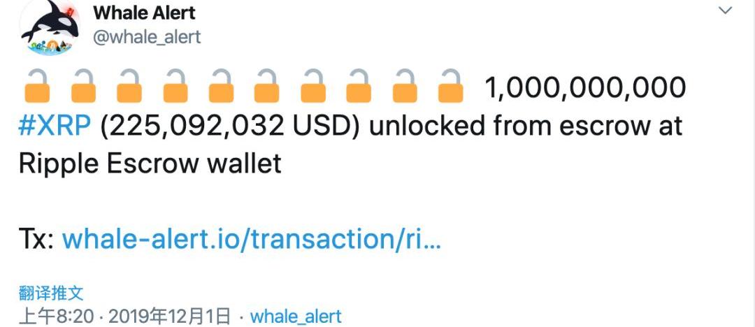 其次,每月解锁的XRP并不是100%流通出去,没有用完的XRP会重新返还给托管钱包,好比12月1日的这一次,10亿XRP解锁在16个小时之后通过两笔转账打回给了托管钱包。