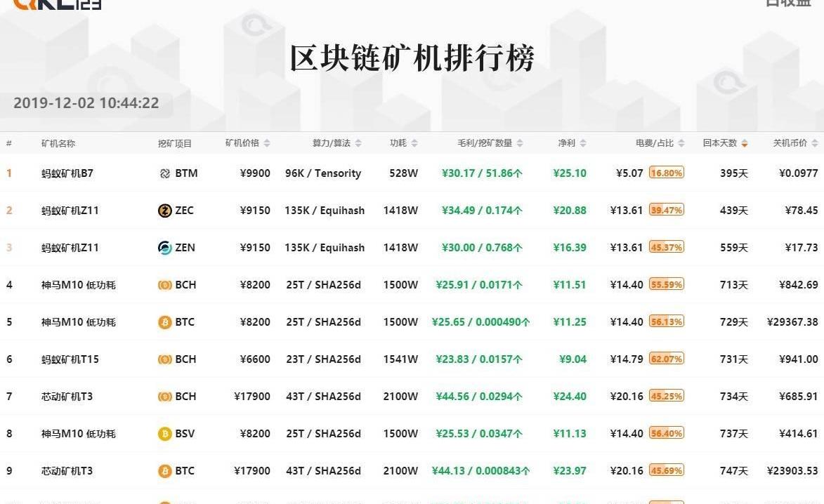 按照12月02日当日的Token价格和默认算力、电费等指标来计算,用来挖取BTM的蚂蚁矿机B7回本天数最短,其预期回本天数和预期日净利分别为395天和25.10元。其次是用来挖取ZEC和ZEN的蚂蚁矿机Z11,二者的预期回本天数分别为439天和559天,对应预期日净利分别为20.88元和16.39元。其他回本天数排名前十的矿机,都用于挖取SHA256算法的加密资产,资产种类包括BCH、BTC和BSV。