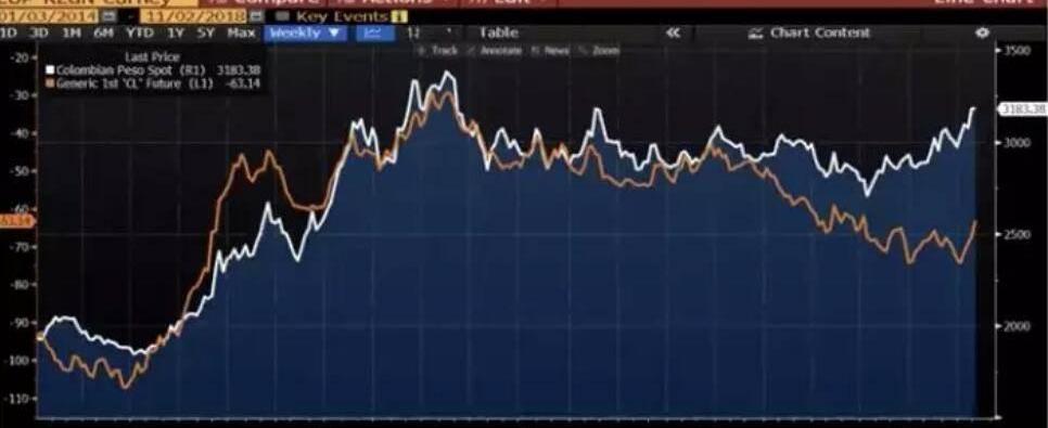 在证明资产多样化问题时,艾莉森·卢(AllisonLu)展示了一幅图表,显示哥伦比亚比索与原油价格高度相关,因为哥伦比亚经济严重依赖石油出口: