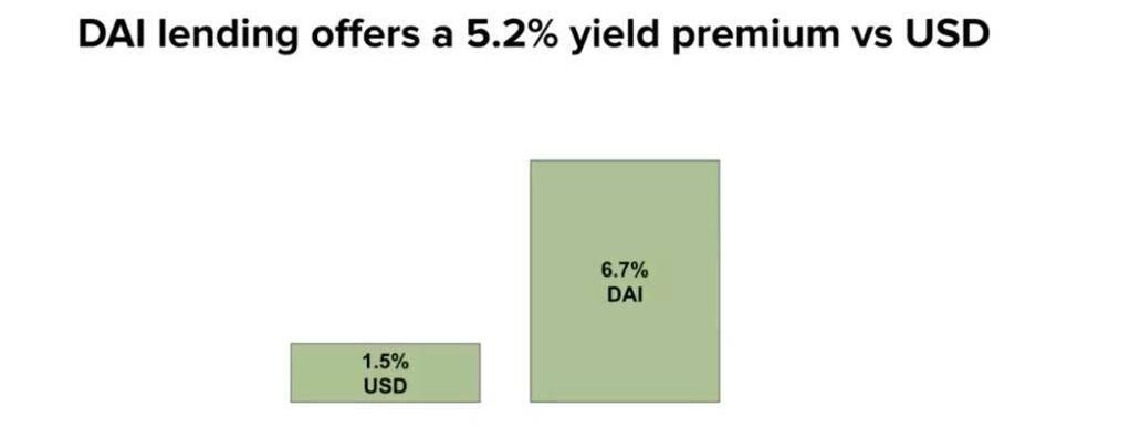 Staked集团的TimOgilvie分享了这张幻灯片,展示了10年期美国国债和DAI上的贷款利率差异: