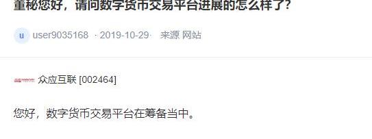 11月20日下午,深交所上市公司众应互联(SZ:002464)在回复用户提问时表示,目前众应互联(SZ:002464)的数字货币交易平台正在筹备当中。