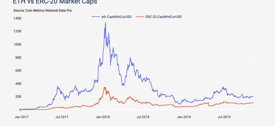 衡量token价值的一种方法是,将以太坊上原生货币的市值与所有发布在该平台上的token的总市值进行比较。就像ChrisBurniske所提议的那样,我们称其为“全网价值/token价值”比。