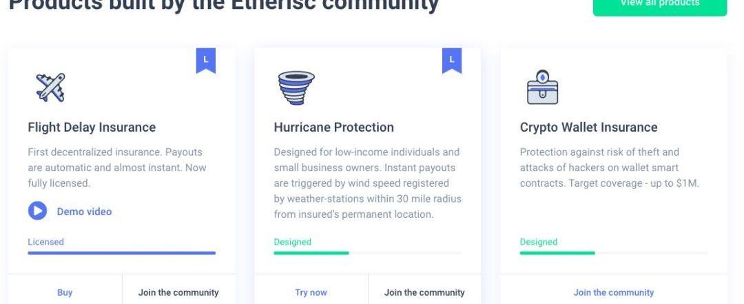 目前Etherisc社区设计了一套基本的保险产品,范围覆盖从航班延误保险、飓风保险到加密钱包和贷款抵押保险,不过大部分看起来都只是demo测试。