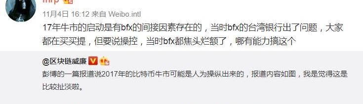 也有微博用户表示,该论文所说的单一巨鲸带动比特币价格的飙升与Bitfinex涉嫌操纵市场的观点并不可靠。用户@fhrp表示,Bitfinex当时忙于处理银行的问题没空去操纵市场;@区块链威廉表示,牛市的发生不可能只是因为单只巨鲸。