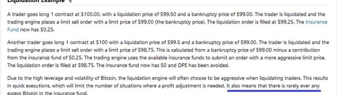 由于比特币的高杠杆和波动性,清算引擎在清算交易者时通常会选择更激进的方案。这将导致快速执行,这会导致限制需要调整利润情况的数量。这也表示保险基金中几乎没有超额的比特币。