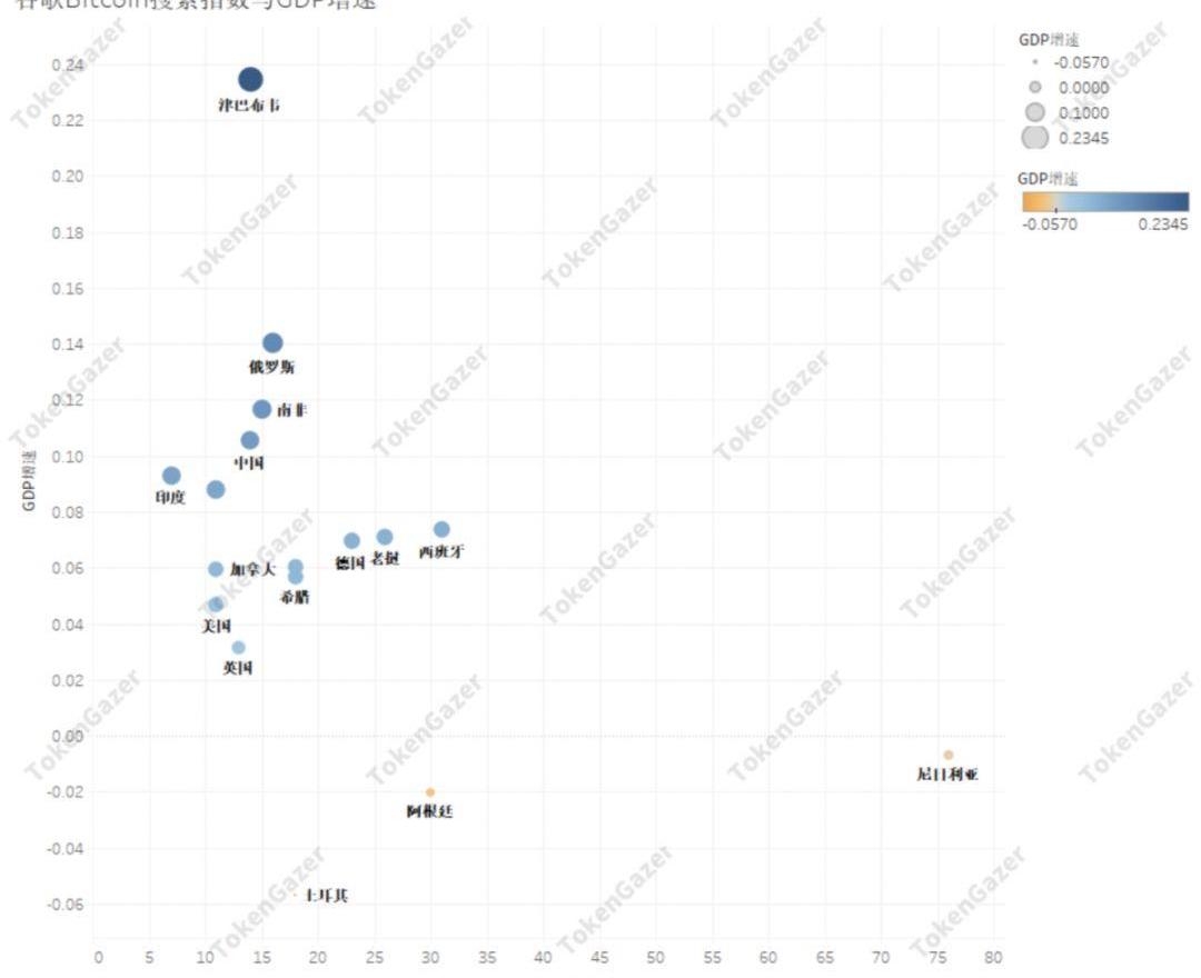GDP增速和比特币搜索指数的相关性不强,比如津巴布韦和英国的GDP增速相差巨大,但他们的比特币搜索指数比较接近。但是尼日利亚、阿根廷、土耳其最近几年也确实存在GDP下降的问题,他们的比特币搜索指数都在平均值以上。