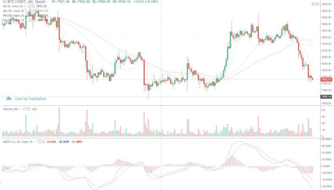 BTC:压力位持续保持在$8,300一线,承压下跌,支撑区间在$7,700附近,但若再次试探,将大幅增加破位概率。