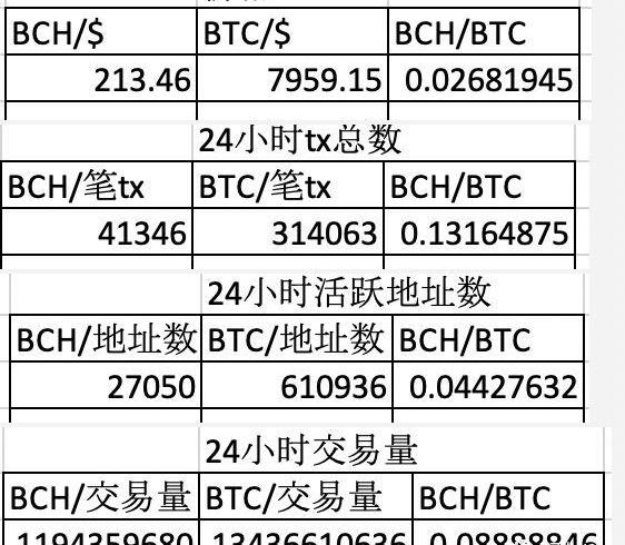 过去24小时BTC的活跃地址数为622343,BCH为27138,两者比值为27138/622343=0.0436=4.36%。