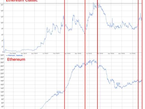 虽然不同于比特币以及莱特币每四年一次的区块奖励减半,但从历史数据上看,ETC减产期间同样出现了类似的“减半行情”;其价格于减产当月达到历史高点46.17美元,月内涨幅近20%。当然该时间段的减产碰巧撞上了17年的牛市,ETC价格上涨到底多少受到减产影响还有待考究。而如果按照“减半行情”的剧情发展,ETC价格会走出上涨趋势;与此同时在难度炸弹启动、ETH挖矿收益锐减的大背景下,ETC矿链将有承接部分ETH算力的可能。虽说这样不足以让以太坊经典逆袭,但是凭借着算力以及价格的增长,摆脱“末日战车”的名号还是可以的。
