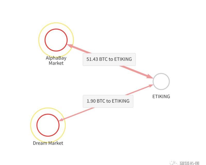 另一方面,在暗网上使用加密货币交易,对买卖双方来说都增加了一层匿名性。但是,加密货币交易依然会在区块链上留下永久记录,这也为执法机构提供了调查非法交易的机会。借助Chainalysis,分析师可以追踪区块链中的资金、查询与加密货币交易有关的数据、并且将这些交易关联到现实世界中相应的实体。芬太尼交易商ETIKING此前在暗网AlphaBay上非常活跃,直到2018年被捕,本文将对ETIKING此前处理过的加密货币交易进行分析。