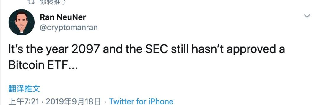 ETF被推迟也是见怪不怪的事情了,币圈人早已习惯。CNBC加密频道主持人RanNeuNer发推调侃”现在是2097年,美国证券交易委员会还没有通过比特币ETF。“
