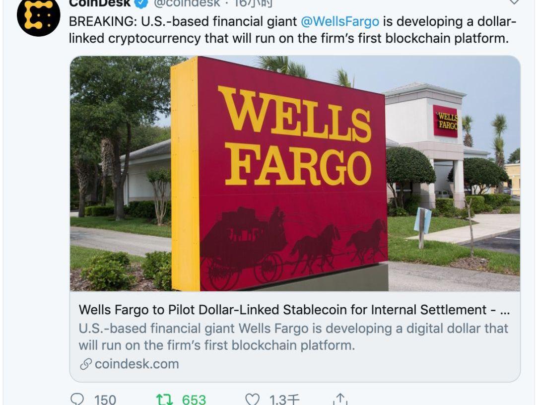 3、据CoinDesk报道,美国金融巨头富国银行正在开发一种与美元挂钩的加密货币WellCoin,该加密货币将在该公司的第一个区块链平台上运行。据悉,WellCoin将首先用于内部结算试用。