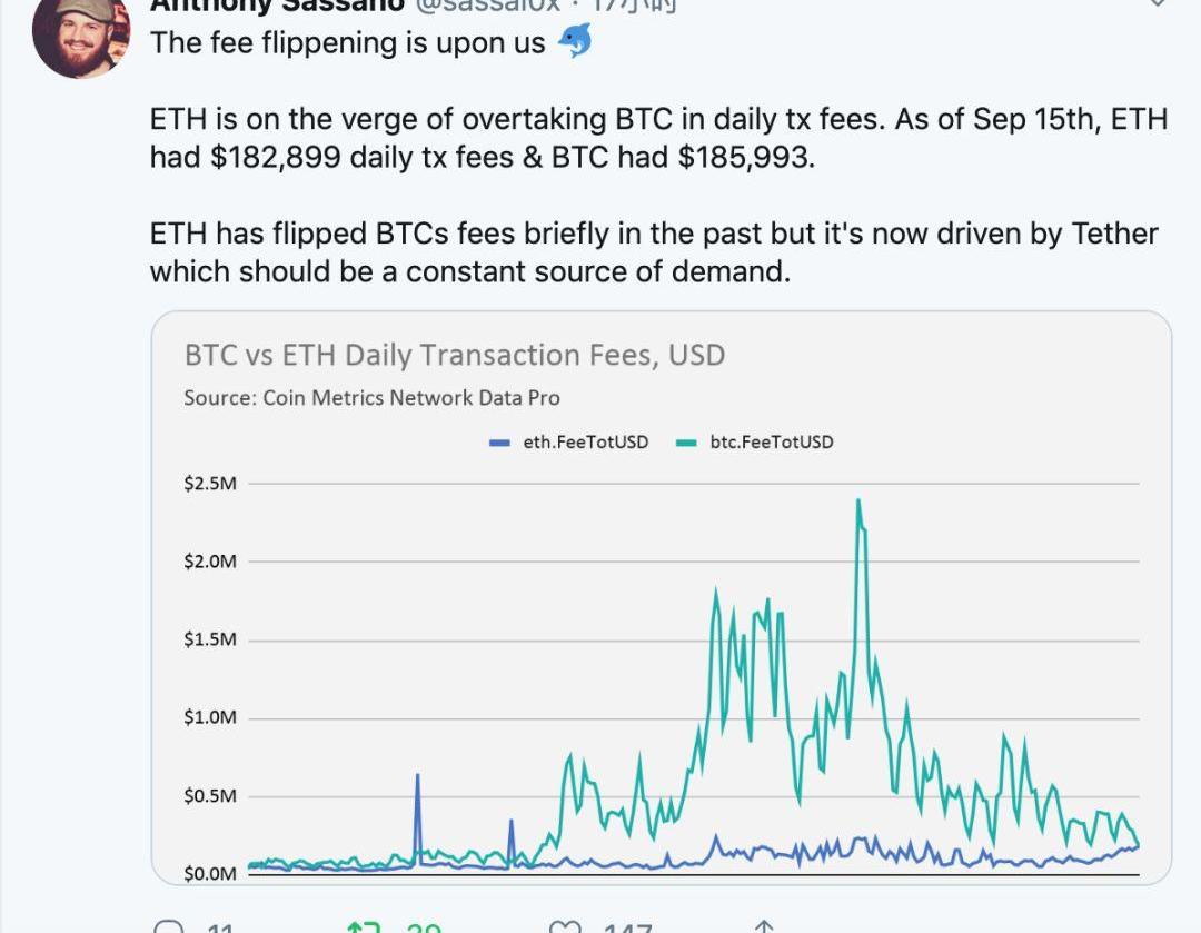 以太坊每日交易费用即将超过比特币。截止9月15日,以太坊每日交易费用182899美元,比特币每日交易费用为185993美元。