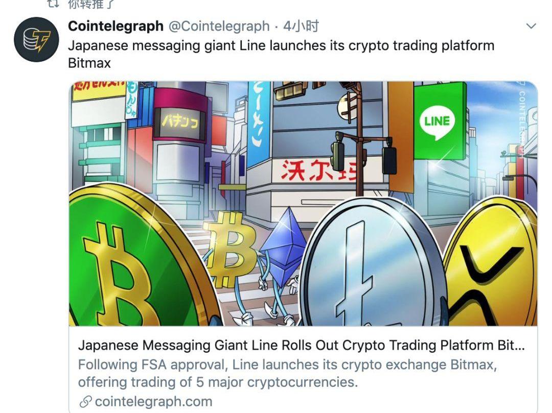 1、据Cointelegraph报道,日本社交通讯巨头Line推出其加密货币交易平台—Bitmax,初期将会支持BTC、BCH、ETH、XRP、LTC等五个币种的交易。