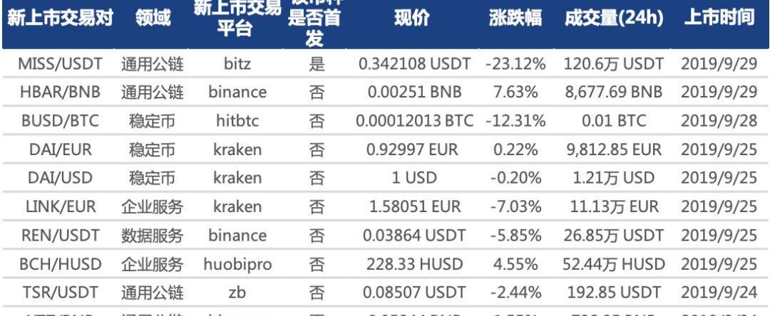 OKEx、Binance、HuobiGlobal、Bitfinex、Bithumb、ZB.com、Upbit、HitBTC、Bittrex、Poloniex等30?家交易平台,新上市交易对10个。