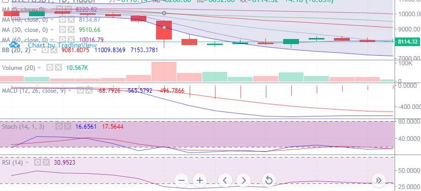 BTC今日形成反弹至5日均线一带受阻调整,随后再度被向下压制,当前价位处在10日均线一线运行,上行力度减弱,走势区域胶着,5日均线上穿10日均线形成金叉,走势有进一步向上的趋势,而MACD指标在0轴下方趋于平行,STOCH指标在20水平线保持胶着粘合的姿态,向上意志不强,走势持续被压制在5日均线下方,局势仍然处于调整阶段,若后续走势能突破至8300一线,则有望形成上行趋势;RSI指标在20水平线一线保持平行,后续走势将进入震荡调整的趋势中。