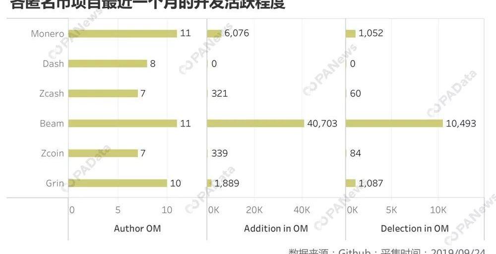 开发者人数来看,纯社区驱动的Grin有136人参与开发,虽然明显少于Monero、Zcash和Dash这样的老牌项目,但已经比Beam和Zcoin的参与人数更多了。