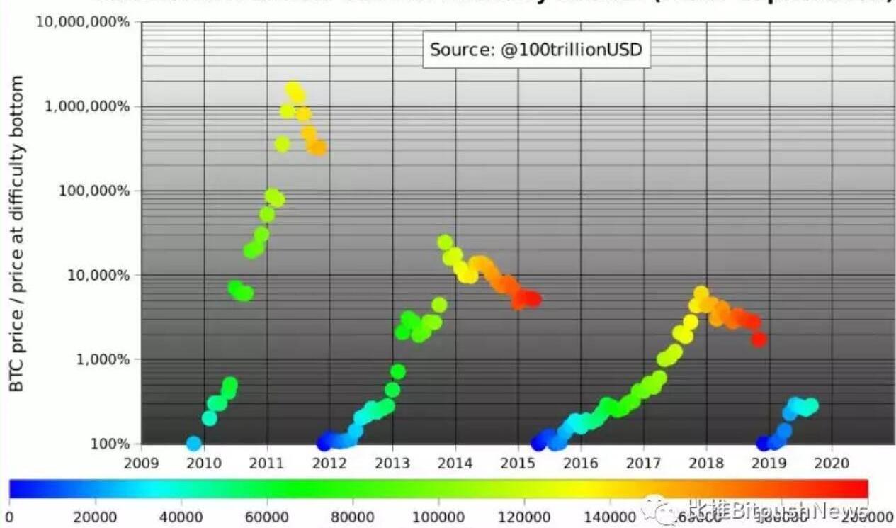 在图表中可以看到,在2013年底比特币的价格高达1300美元,与上一个难度低点相比上涨了50000%。而在2017年末比特币的价格为20000美元,其相比于前一个难度地点上涨了9000%。