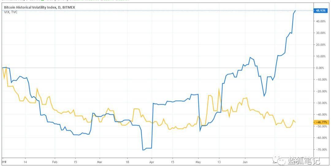 Bitmex的历史波动性指数今年已上涨48%,而标准普尔隐形波动性指数的跌幅几乎相同,仅略高于历史低点。