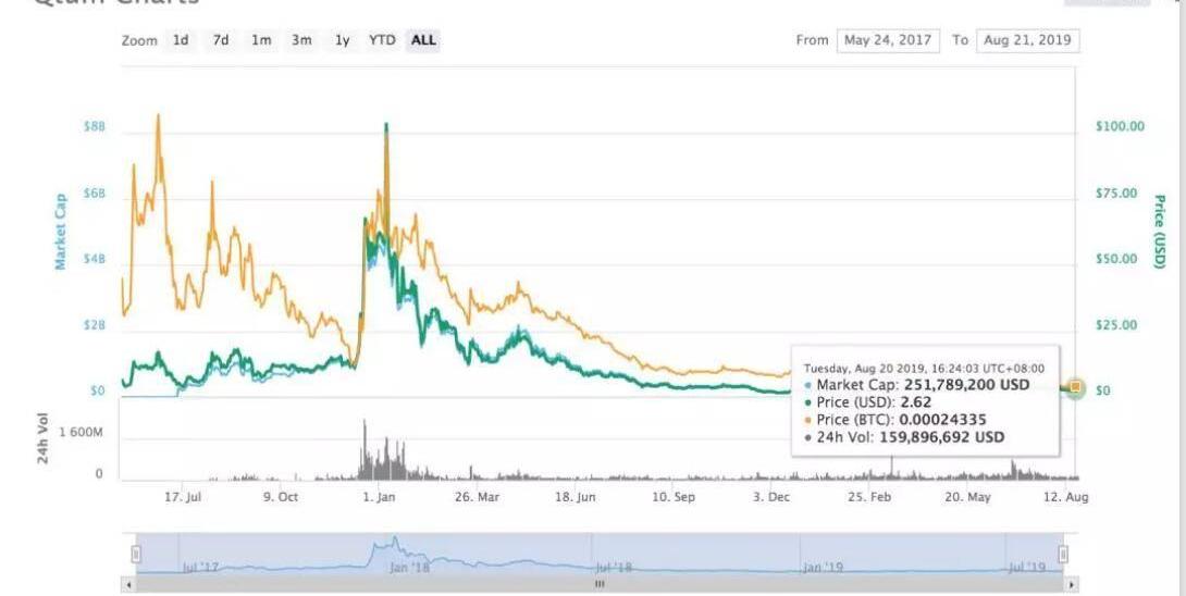 不过,即便如此,量子链的价格也并未如预想的那般光彩,从下图可知,量子链最高价为106.87USDT,最低价格1.5USDT,现价2.5USDT左右,跌幅高达98.5%。