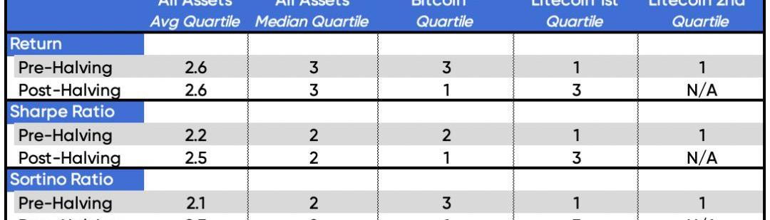 完成分析后,我们发现减半事件对价格走势的影响有限。考察总回报率、夏普比率(Sharpe)和索尔蒂诺(Sortino)比率,可以发现,经历减半的资产,无论是在减半之前还是之后,表现并不比市场其它部分好。在比特币(BTC)和莱特币(LTC)这两种最著名的加密货币中,“减半”的说法是最多的,但我们可以看到截然相反的表现。