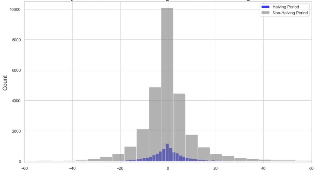 资产减半期间的收益率分布与资产减半期以外的收益率分布的比较。