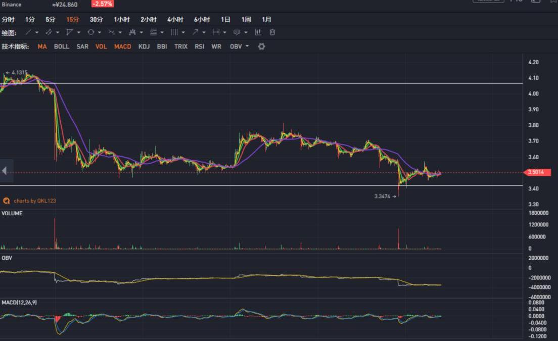 EOS自昨日20时放量下行高低触及3.35美元,空军暂时得到压制,之后快速反弹,但上行至3.57美元后多军乏力,多空在3.5美元附近胶着。昨日EOS/BTC交易对插针至低点0.00033BTC,目前相对弱势调整。