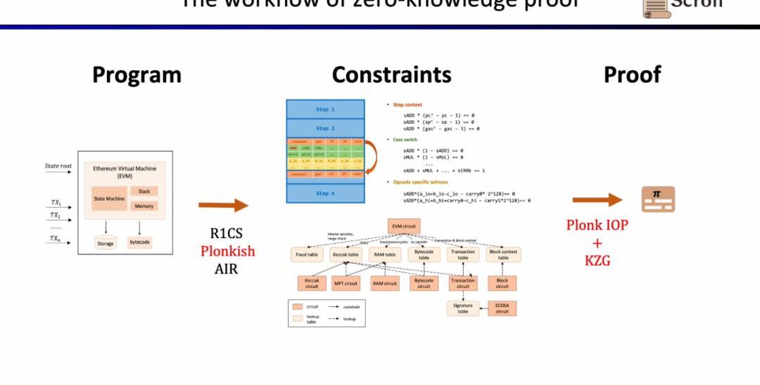 在这里我们需要证明zkEVM,Scroll使用的是Plonkish,PlonkIOP,以及KZG的组合。
