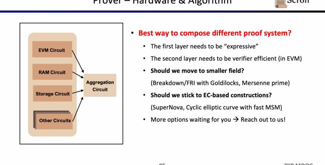 同时Scroll也在探索硬件加速和证明算法方面,来提升证明者的效率。目前主要有两个大方向,或是切换至更小的域,例如使用64位的Goldilocks域,32位的梅森数等,或是坚持基于椭圆曲线的新证明系统,例如SuperNova。当然也有其他的一些别的可能路径,欢迎有想法的朋友直接联系Scroll。