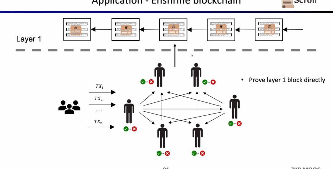 如果我们直接验证L1的区块,那么L1的节点就不需要重复执行交易,只需要验证每一个区块证明的有效性。这样的架构方案称为EnshrineBlockchain。目前在以太坊上直接实现难度非常之大,因为需要验证整个以太坊区块,其中会包括验证大量签名,随之带来更长的证明时间和更低的安全性。当然也已经有一些其他公链在通过递归证明,使用单个证明,来验证整个区块链,例如Mina。