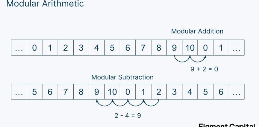 想象一下,我们有一组0-10的数字。我们可以给这组数字添加一条规则,即:一旦我们数过数字10,我们就从数字0重新开始。如果我们减去最低的数字0,我们就从最后的10开始。
