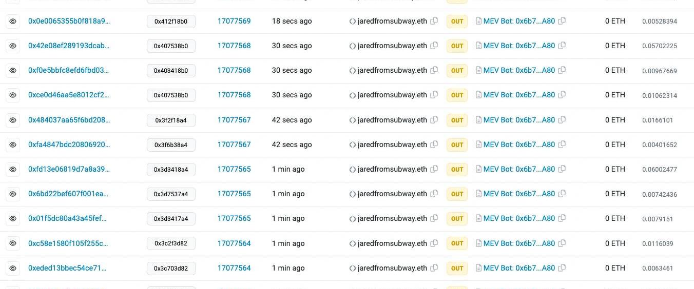 Etherscan?数据显示,jaredfromsubway.eth一直在以秒为单位高频进行交易,每一轮交易的间隔约为12秒左右,这意味着其操作几乎会覆盖每一个区块。