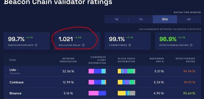 InclusionDelay就是上述计算过程得到的平均值。这个指标反映了验证器attestation的及时性。较低的InclusionDelay意味着验证器提交的attestation能够更快地被记录在链上,从而提高整个网络的效率和安全性