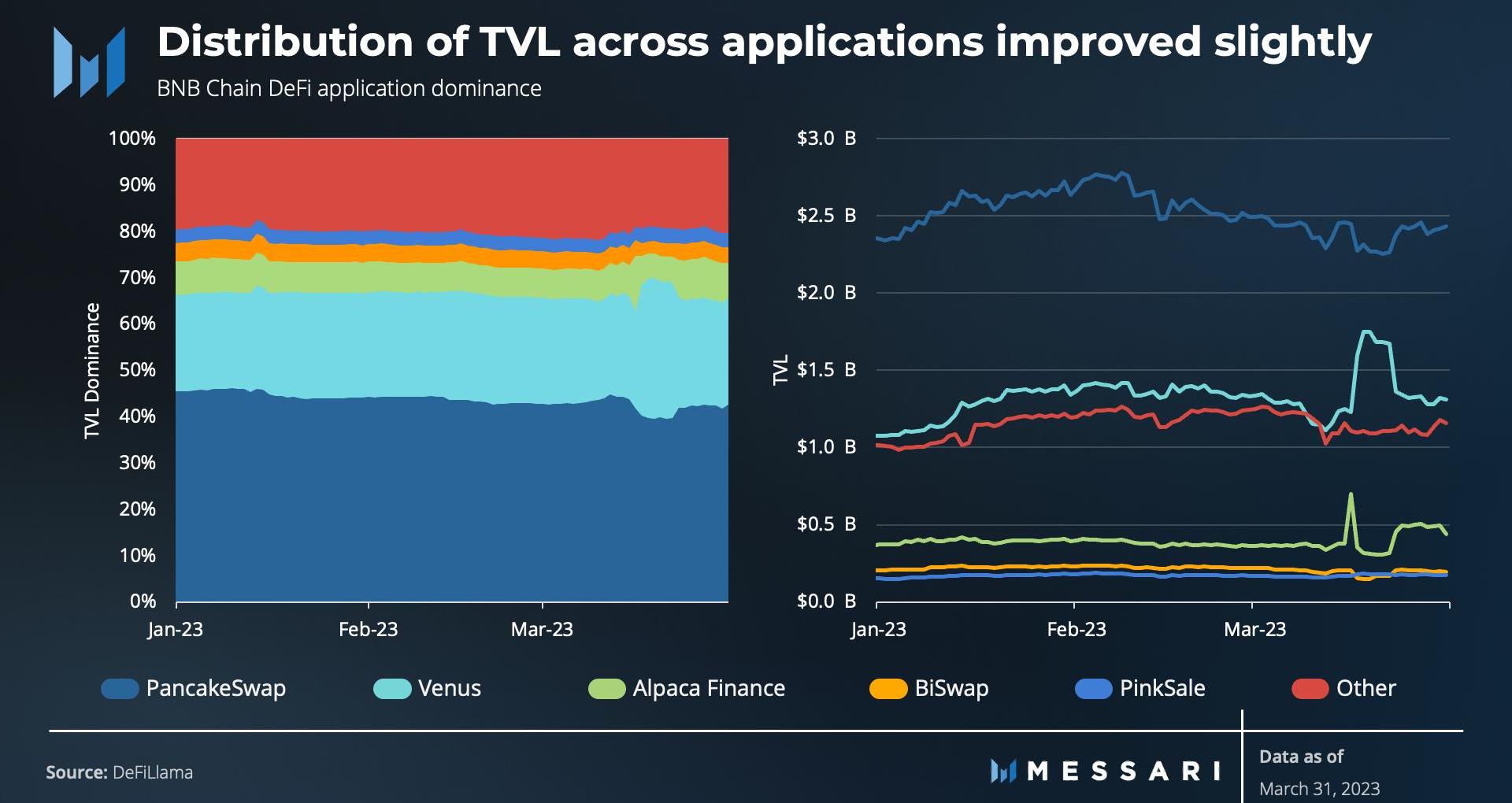 BNBChain上几乎所有的DeFi应用都受益于整个第一季度的市场反弹。BNBChain最突出的协议,PancakeSwap,在TVL方面环比增长了3%。与此同时,Venus和AlpacaFinance上的TVL以两位数的速度增长,导致panakeswap的主导地位连续第三个季度下滑。