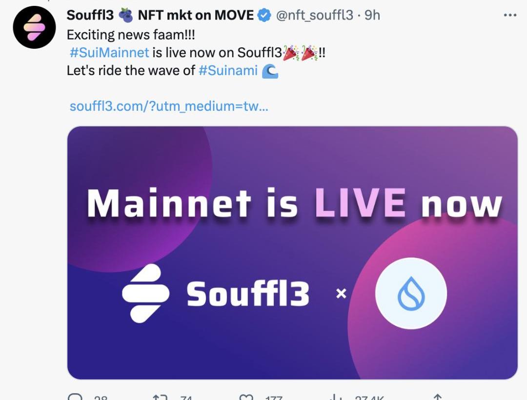 目前SuiNetwork上头部NFT交易平台Souffl3已经上线主网。?