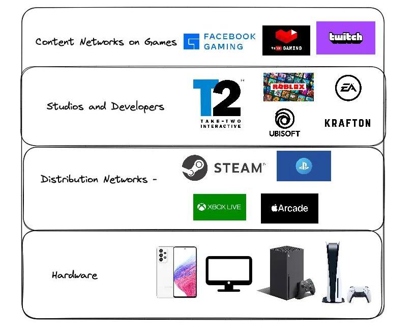 在分销网络之上是开发者,他们开发独立游戏,并从每笔交易中获得收入,其中一部分收益交给平台。最后,独立内容网络围绕游戏系列建立起来,比如Twitch、YouTube和Meta等平台。虽然Twitch最早专注于游戏领域,但YouTube和Meta已经慢慢涉足其中。