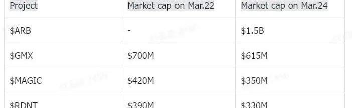 表1.Arbitrum发币后生态市值变化