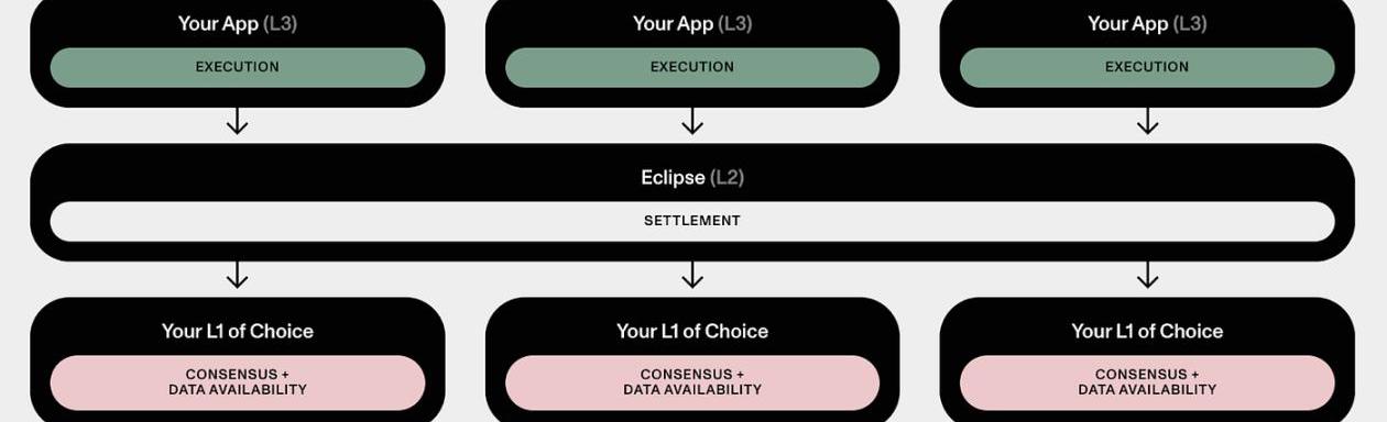 Solana的虚拟机SVM使用Sealevel进行并行事务处理,pipelining可以根据各种硬件规格高效地处理事务。Eclipse是一个Rollup解决方案,开发者可以根据自己的喜好定制各种组件,例如EVM、SVM和MoveVM等执行环境,以及Celestia、PolygonAvailEigenDA等数据可用性层。尽管用Eclipse部署的Rollup可能使用不同的数据可用性层,但它们可以共享Eclipse的结算层。简介