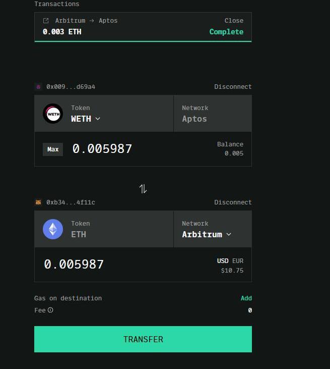 由于接下来2个都是arb-aptos。ETH跨链转回需要2-3天之后才可以,所以少跨一点E刀aptos链。这里跨个0.003E过去大概5刀。