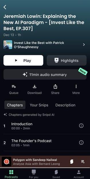 基于播客聚合+智能精华,Snipd产出了大量3分钟以内的highlights,在Foryou这个频道里面做出了类似tiktok的体验,有点意思。是否会颠覆听播客的体验呢?用段时间再来补上进一步的用户体验