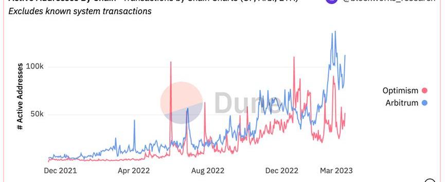 除了公链收入以外,我们再来看看Arbitrum上的每日交易笔数与活跃地址数的对比。
